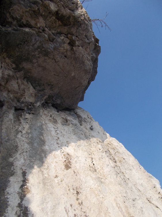 Notiamo il primo chiodo a destra della sosta e il secondo vecchio chiodo appena dietro lo spigolo e gli appoggi lisciati dai passaggi e, curioso, vado per di là. Tiro il secondo chiodo con un moschettone per azzerare e rinviare al nuovo resinato sotto il tetto.