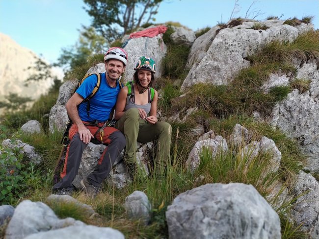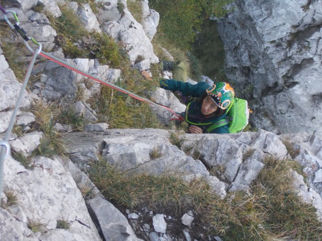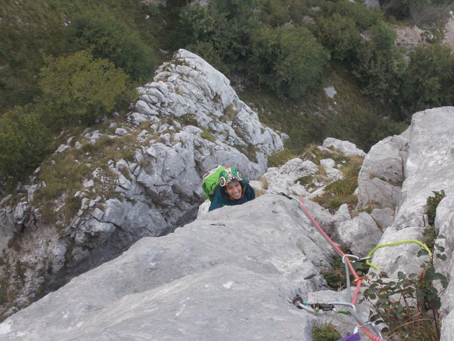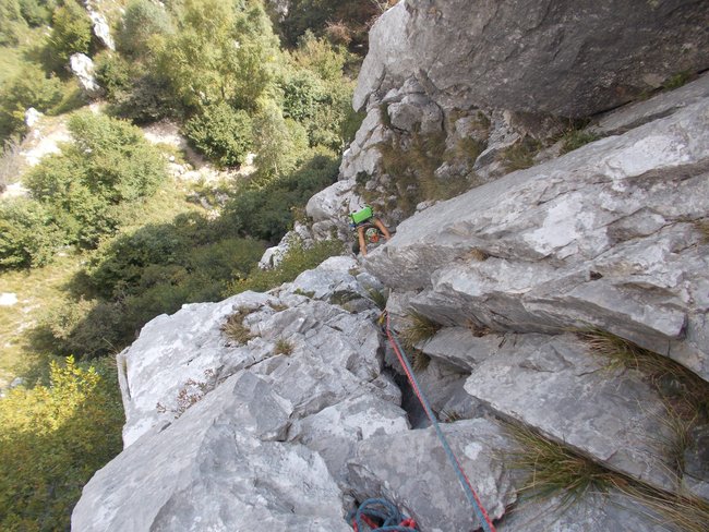Effettivamente parte dei primi due tiri e l'uscita del terzo (per noi il secondo, avendo concatenato i primi due) non presentano roccia sana e bisogna salire molto accorti.
