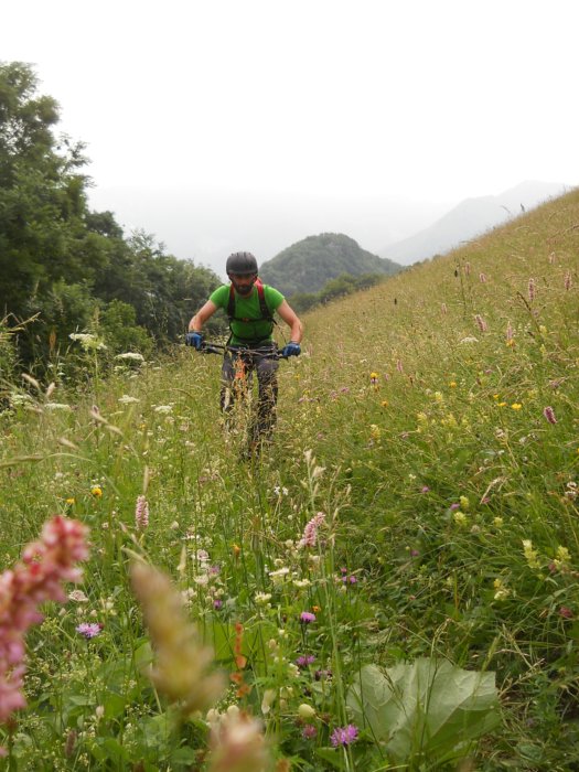 Di salita ne facciamo, ma poco prima della fine della cementata, deviamo a destra per "Cornisella", lungo un bel single track divertente a mezza costa. Arrivati al praticello nei pressi di una baita, c'è un bivio e non prendiamo per Cornisella ma andiamo a sinistra, sempre a mezza costa ma spesso in lieve salita fino ad uscire all'altezza di meravigliosi prati e baite e ricongiungerci sulla sterrata/cementata che porta da Pasturo al Pialeral.