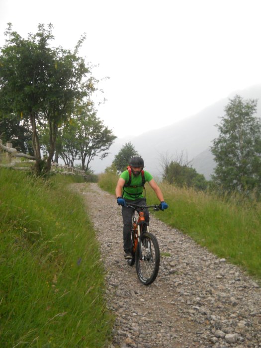 Carletto è alle prime esperienze coi sentieri delle Grigne a pedali, allora si comincia da Balisio per la strada dei Grassi Lunghi che offre la possibilità di scaldarsi man mano che la pendenza aumenta fino a diventare elevatissima nell'ultimo tratto cementato che oggi, bagnato, è tutto un programma.