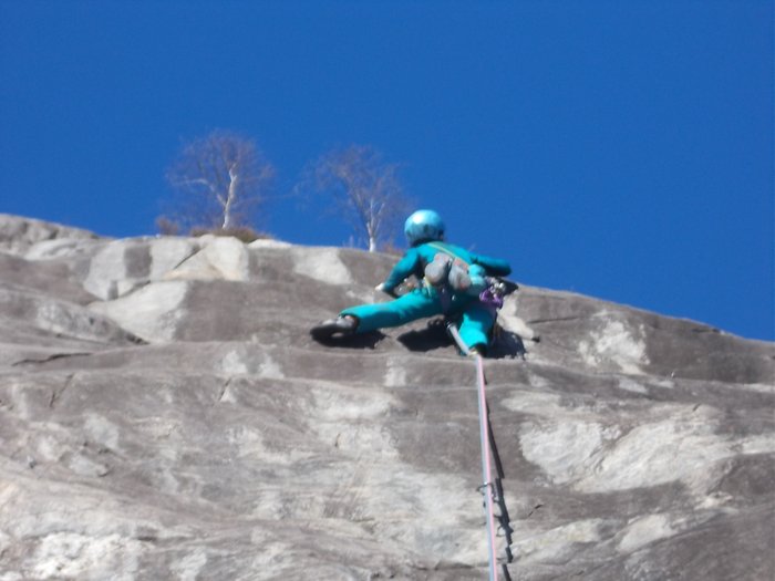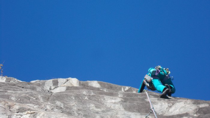 Sale già con le idee chiare e risolve tranquillamente il passaggio in libera e si gode il tiro che, dopo il primo risalto, scende un filo di difficoltà e si stabilizza su un bel 4c 5a molto continuo. Sosta!