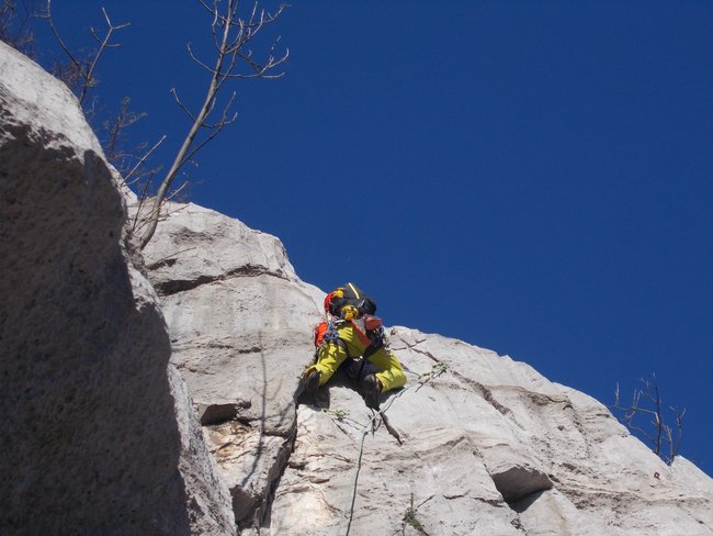 Mi faccio calare fino a staccare il rinvio dal vecchio spit in modo che la corda scivoli bene e poi risalgo a recuperare il mio socio!
