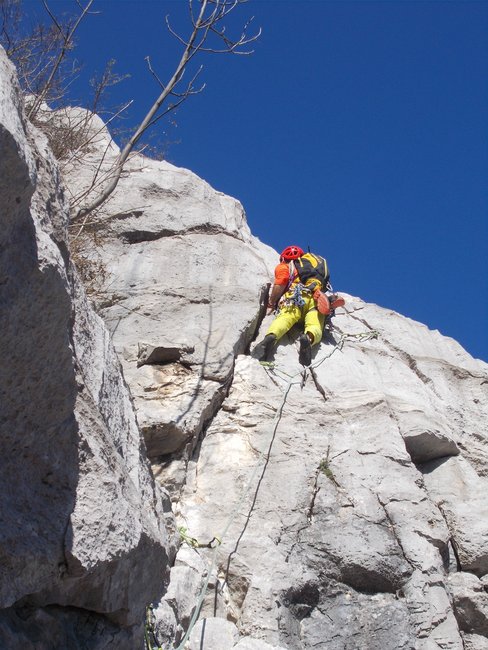 Il tiro chiave, nonché secondo e ultimo spetta al Toso. I passi determinanti sono molto ben protetti. Quello verso sinistra, qualche metro sopra alla sosta e il passo d'uscita che, mah! Il V+ forse è un'altra cosa ...ma sarò io che sono diventato superscarso...comunque, invitato dal Toso a provare a non azzerare, da secondo lo percorrerò in libera a corda morbida facendo un po' di fatica!
