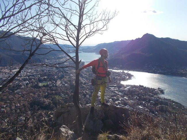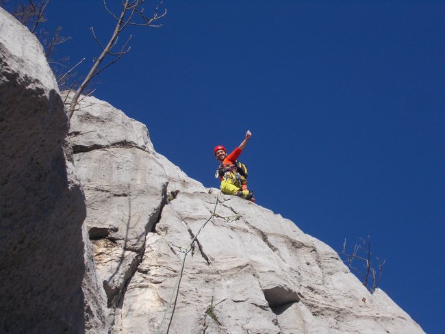 Toso ovviamente se la mangia a colazione anche nei passi di VI che, volendo fare i fighi si grada VI- ma io figo non sono...e ci godiamo quell'oretta abbondante che la via ci richiede tra una foto e l'altra, un po' di chiacchiere e l'ammirazione dei luoghi circostanti immersi in un cielo blu da cartolina!