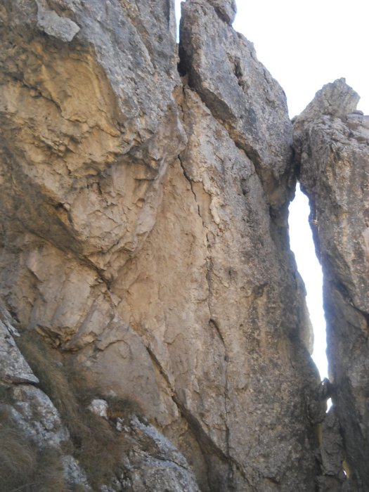 Mentre salgo noto una spaccatura piuttosto recente, angolosa e fresca su un piccolo torrione di fianco al sentiero...è il suo destino quello di cadere, ma mi inquieta pensando a quando verrà giù...