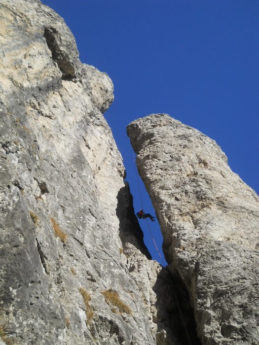 Scende in sosta Silvy assicurata da un mio mezzo barcaiolo, quando recupera la corda inizia a mandarla giù nel precipizio, poi mi recupera sempre su mezzo barcaiolo.