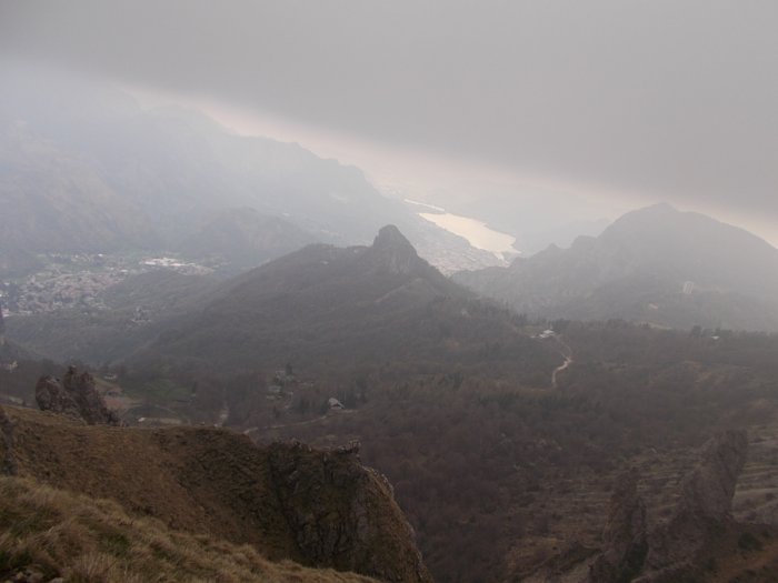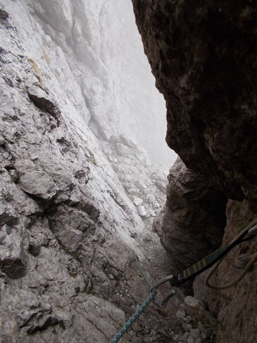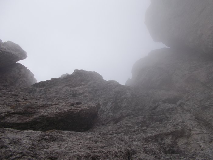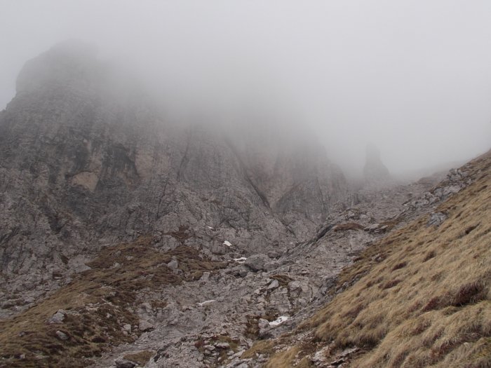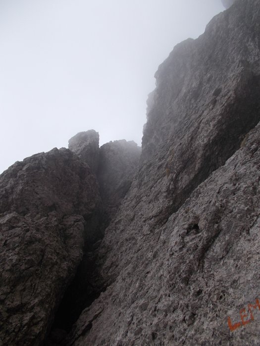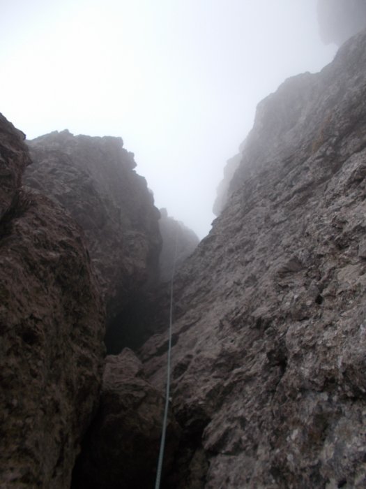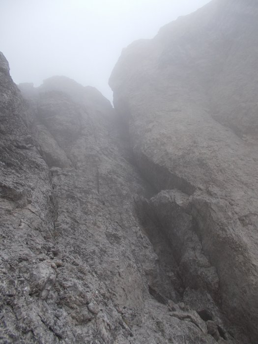 Con qualche nuvola in meno vedo che il camino si biforca e il vago canale/rampa ci sta in mezzo. Il camino di sinistra mi sembra troppo liscio e verticale per affrontarlo.
