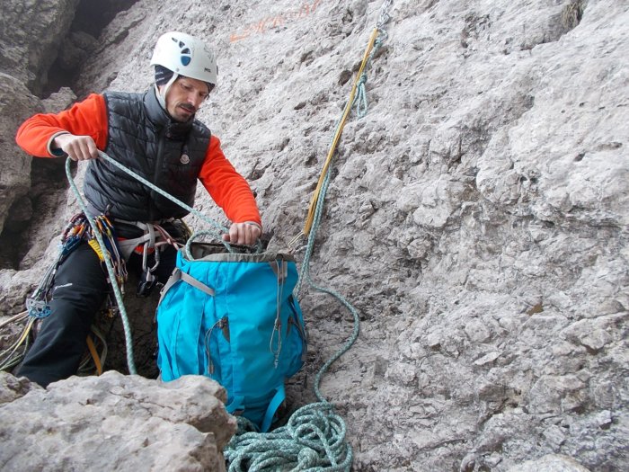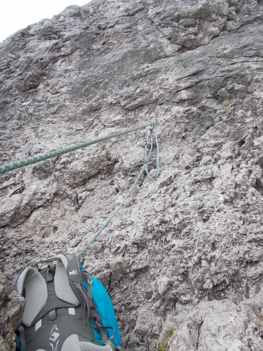 La corda è nel comparto superiore dello zaino riservato solo per lei. Sotto c'è tutto il resto. L'altro materiale è già all'imbrago da quando ho iniziato a camminare...