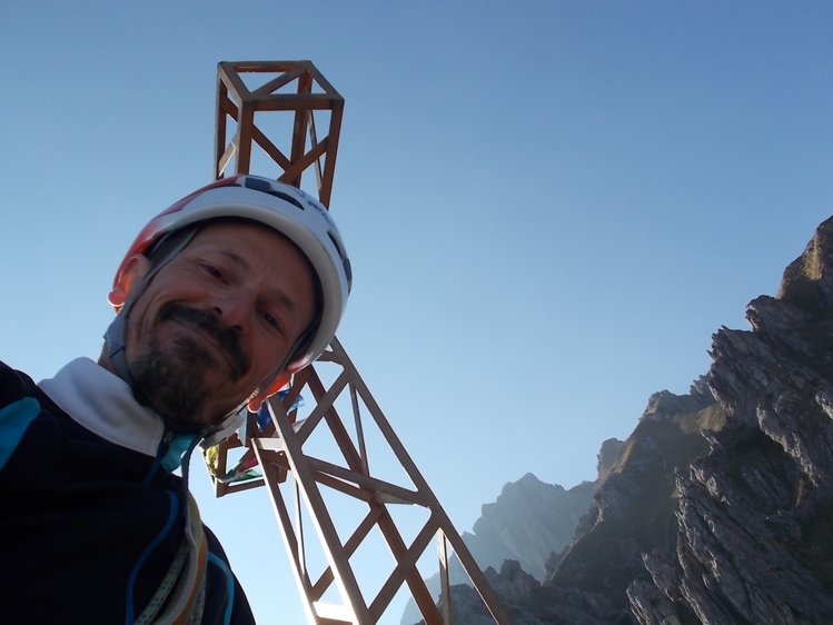 Ho fatto il tutto in due tiri. Forse la corda da 70m sarebbe bastata per arrivare in cima in un unica tirata ma non mi sono fidato e ho fatto sosta su fittone e spuntone alla base del camino finale che mi son poi goduto senza zaino in spalla andando a cercare il sole presso la croce di vetta.