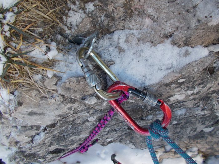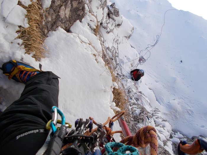 Ci tiene l'unica parte davvero affidabile della sosta, il mio barcaiolo fatto su un chiodo a foglia ancora di mio papà che suonava perfettamente dentro quella fessura trovata dopo un quarto d'ora a ripulire la base parete dal ghiaccio...l'altro punto era un friend che sembrava buono ma in realtà si mostra poco raccomandabile già poco tempo dopo la trattenuta.