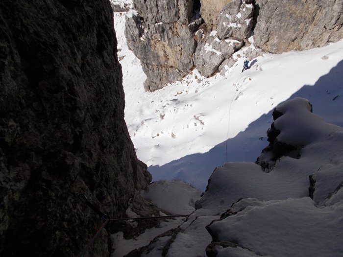 L'uscita è molto delicata. La dicono delicata in estate seppur di III+, figuriamoci in inverno con tutto quel ghiaccio e gli appigli ricoperti...