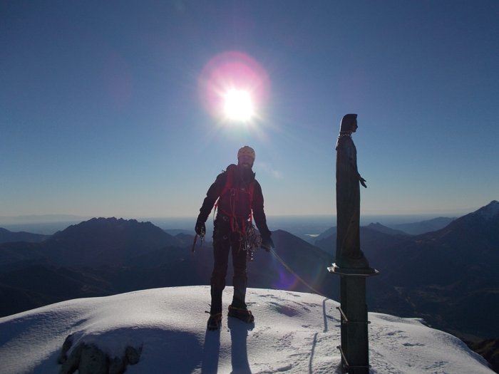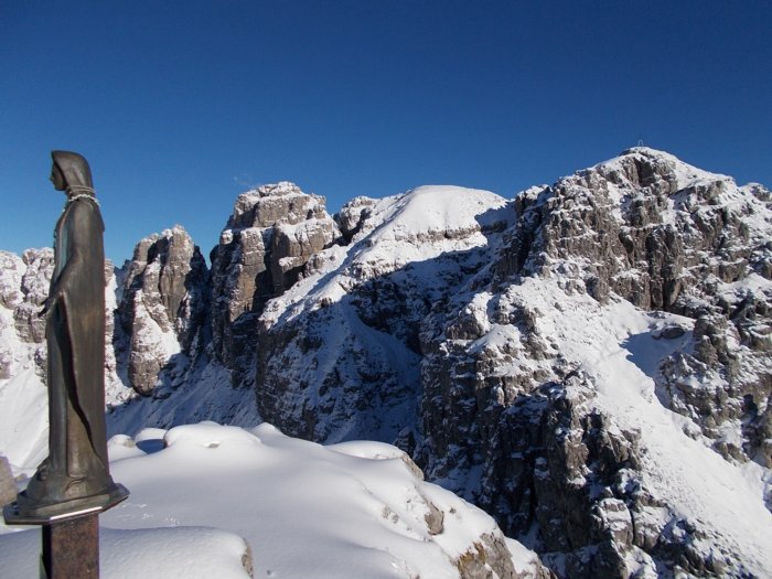 Il canale della Madonnina è una bella lastra intonsa senza impronte. E' magnifico percorrerlo così, tracciarlo e ripulirlo da qualche piccolo lastroncino di infida neve ghiacciata e mi sento almeno minimamente utile per la discesa dei miei amici che, almeno in un tratto di una quarantina di metri, andrà fatta fronte al pendio e la troveranno gradinata.