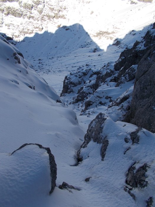 Risaliamo il canale a 40° facilissimo, cementato dal gelo, ma con venti cm di neve ghiacciata pronta a intrappolarti alla minima scivolata...picca d'obbligo e ramponi perchè no...