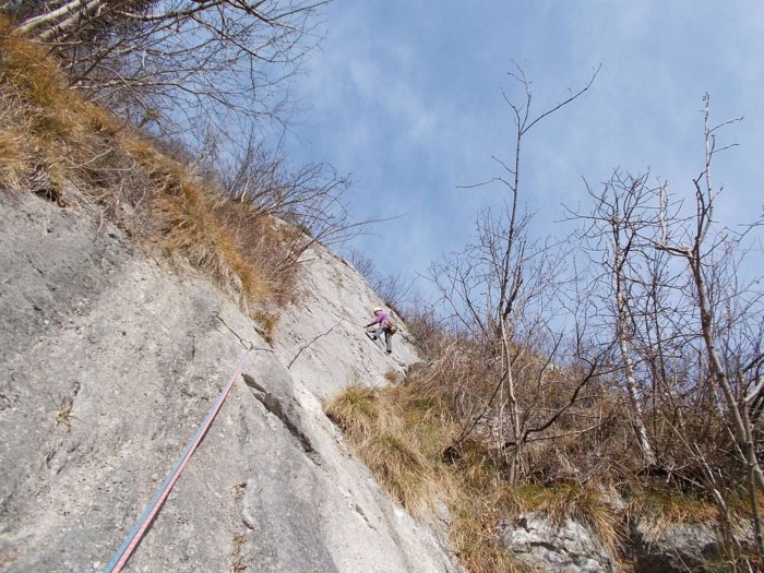 Dal primo al secondo resinato non ricordo, comunque la placca è piuttosto dritta, mancano in quel caso maniglie o tacche nette. La roccia è bella, non è mai difficile (anche se su qualche guida che ho a casa, ora leggo 5c/5b obbligato...) non si riesce ad integrare un gran che e alla rinviata più lunga mi trovo un po' sulle uova con la scarpetta che appoggia in fondo a una lama piena di erbetta secca scivolosa e l'altra su una rughetta con carico qualche grammo del mio peso...la mano sinistra stringe inutilmente una lama verticale con poca presa...