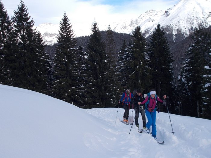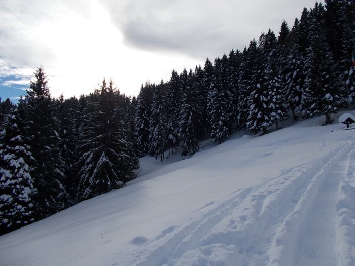 Su a Spiazzi di Gromo (BG) andiamo al parcheggino a valle della pista di fondo e poi su per il bosco, sci ai piedi, fino alle seggiovie e poi ancora su, sempre nel bosco meraviglioso a sinistra della prima ripida pista da discesa non battuta...