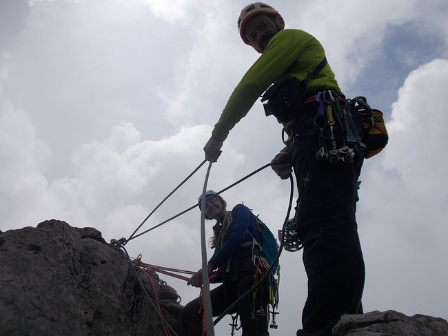 Partito io per fare 15 m di III e IV, forse IV+ in 45 minuti di cui 3 minuti per il IV+ e il resto dei minuti a buttar giù sassi e muoversi come su velluto per poi fare sosta in un posto assurdo sotto probabili bombe ad orologeria ma era l'unico posto di roccia un po' sana dove due chiodi tenevano!!! Poi...