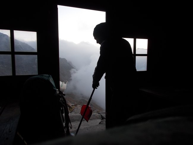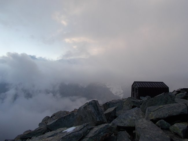 Stamattina alle 6:30 sveglia con 1°C nel bivacco avvolto dalle nubi.
