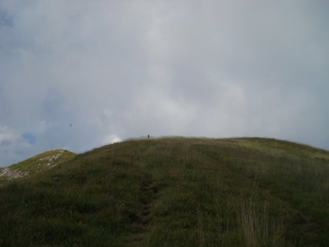 Prima per l'ampio crestino tondeggiande ma molto ripido a destra e poi si svolta a sinistra sul divertentissimo sentierino tra gli alti fili d'erba.