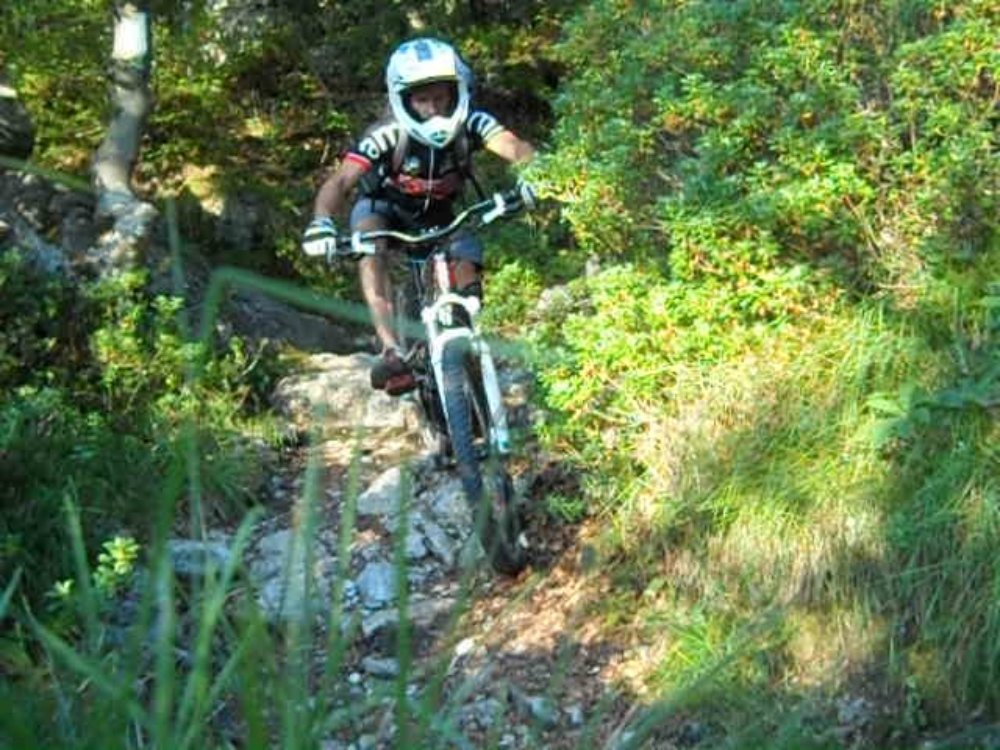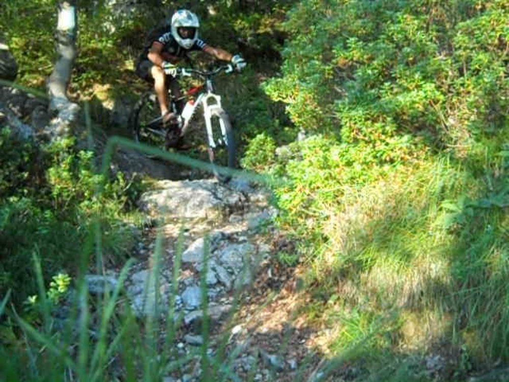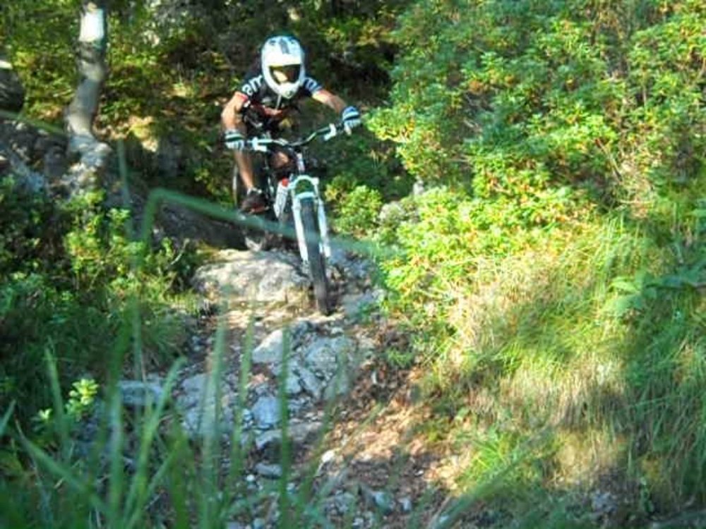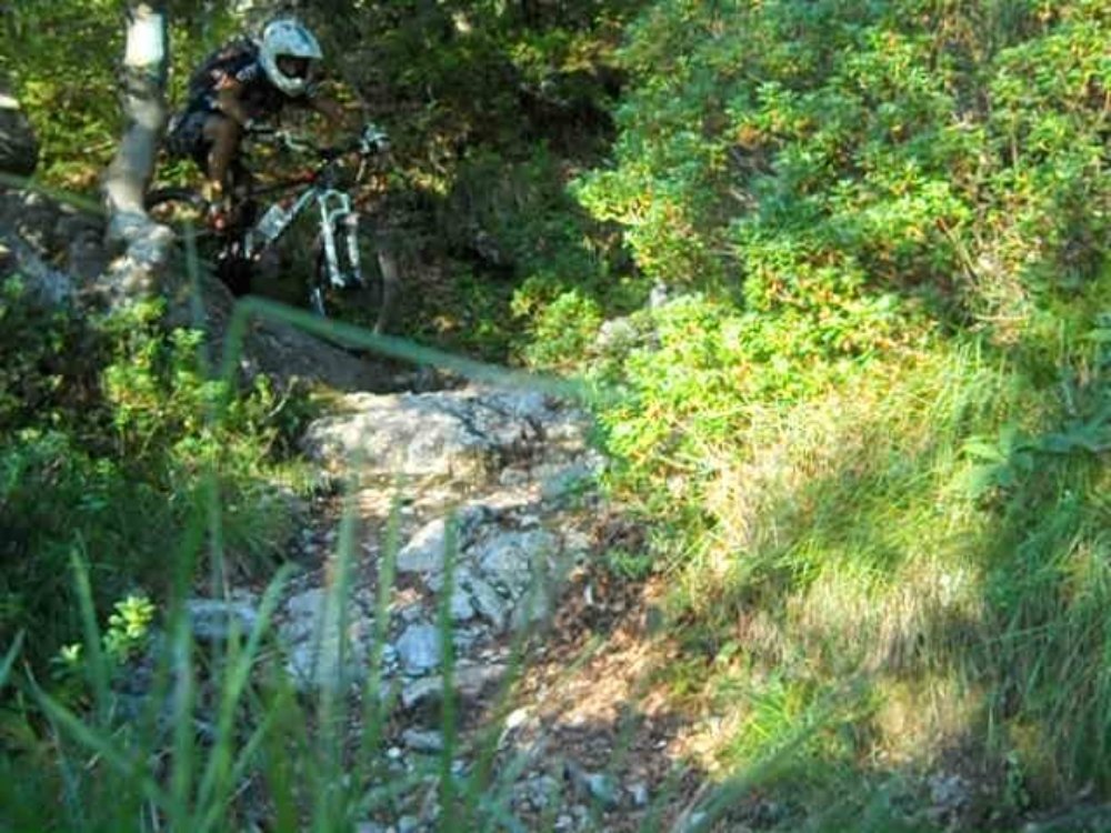 L'ultima vera difficoltà si presenta quando il sentiero si congiunge col fondovalle e, con il torrente vicino, si riempie di ciotoli smossi di dimensioni decimetriche su cui la ruota davanti deve girare ma non è come dirlo. Rischia sempre di impuntarsi o di non curvare...